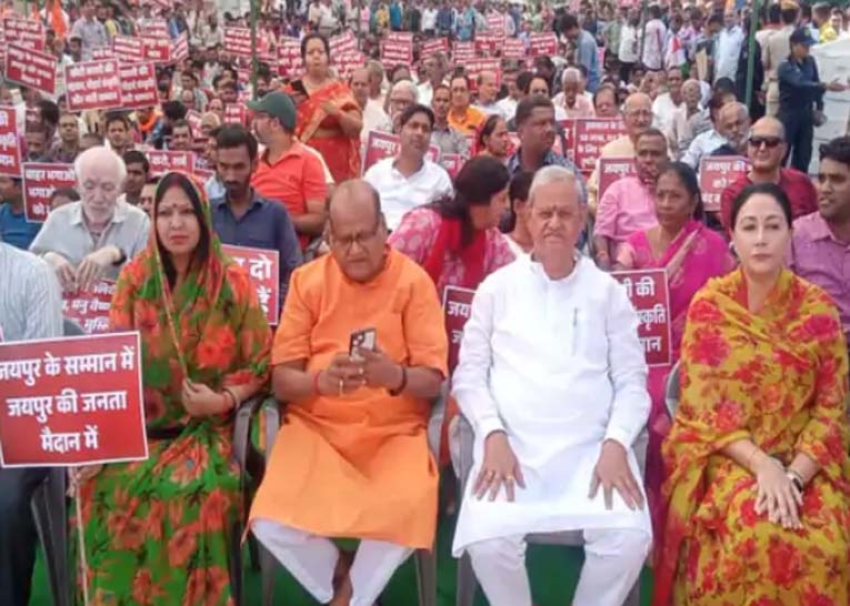 जयपुर। राजधानी जयपुर में युवक की पीट-पीटकर हत्या के मामले को सांप्रदायिक रंग देने के विरोध में जयपुर बचाओ संघर्ष समिति के बैनर तले सर्व समाज की ओर से बड़ी चौपड़ पर सुबह 10 बजे से दोपहर 12.30 बजे तक धरना दिया। धरने में विश्व हिंदू परिषद सहित अन्य हिंदूवादी संगठनों के लोगों के साथ ही बड़ी संख्या में व्यापारी भी शामिल हुए। इस दौरान परकोटा के बाजार भी बंद रहे। इस धरने में संसद दीया कुमारी, रामचरण बोहरा, सतीश पुनिया, अशोक लाहोटी समेत कई भाजपा नेता शामिल हुए। सांसद दीया कुमारी ने कहा- कांग्रेस सरकार वोट बैंक के लिए तुष्टिकरण की राजनीति कर रही है।